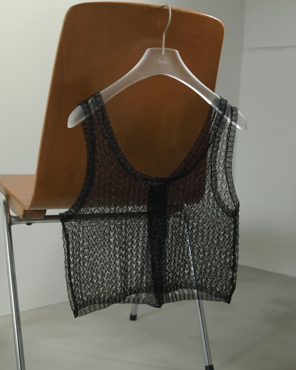メタリック糸を使用したメッシュ編みニットトップス。ハリのある細番手のメタリック糸で、シャリ味のある風合い。ベアトップなどと合わせてシアー感を楽しんだり、シンプルなTシャツやワンピースの上にレイヤードするのもおすすめ。フラットな素材のアイテムと合わせるだけで、コーディネートに奥行きが生まれ、スタイリングが新鮮に見える一枚です。
