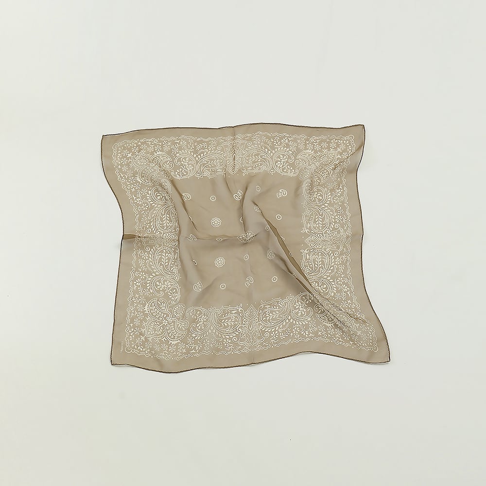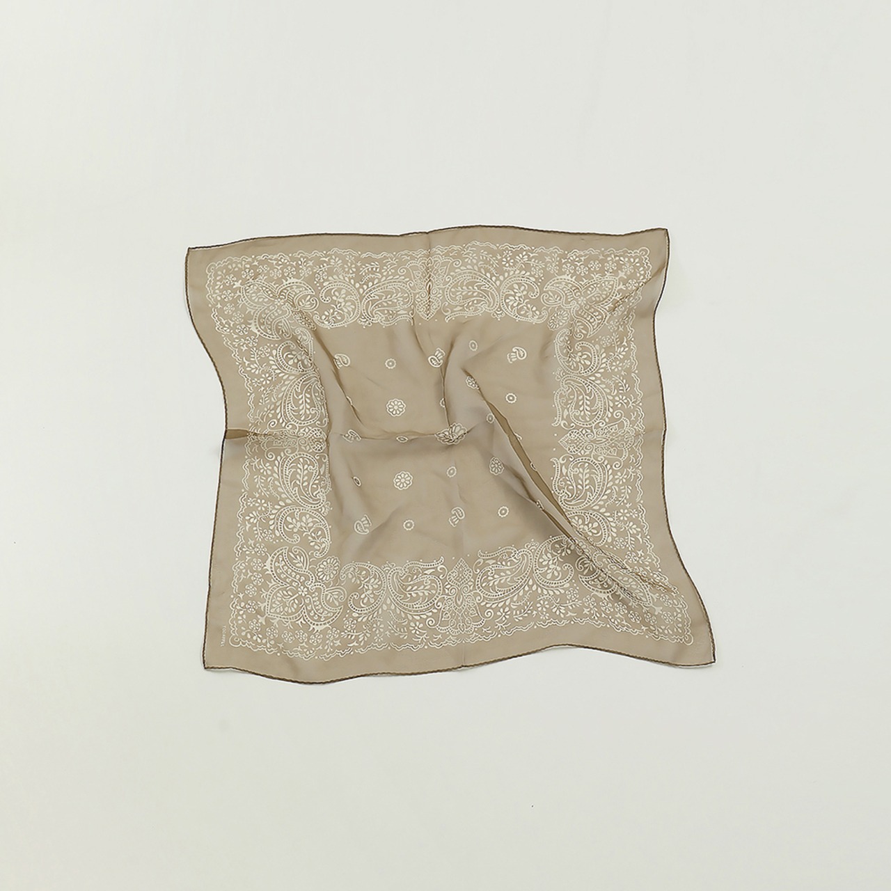 透け感のあるシルク生地にオリジナルのペイズリー柄をプリントしたスカーフ。