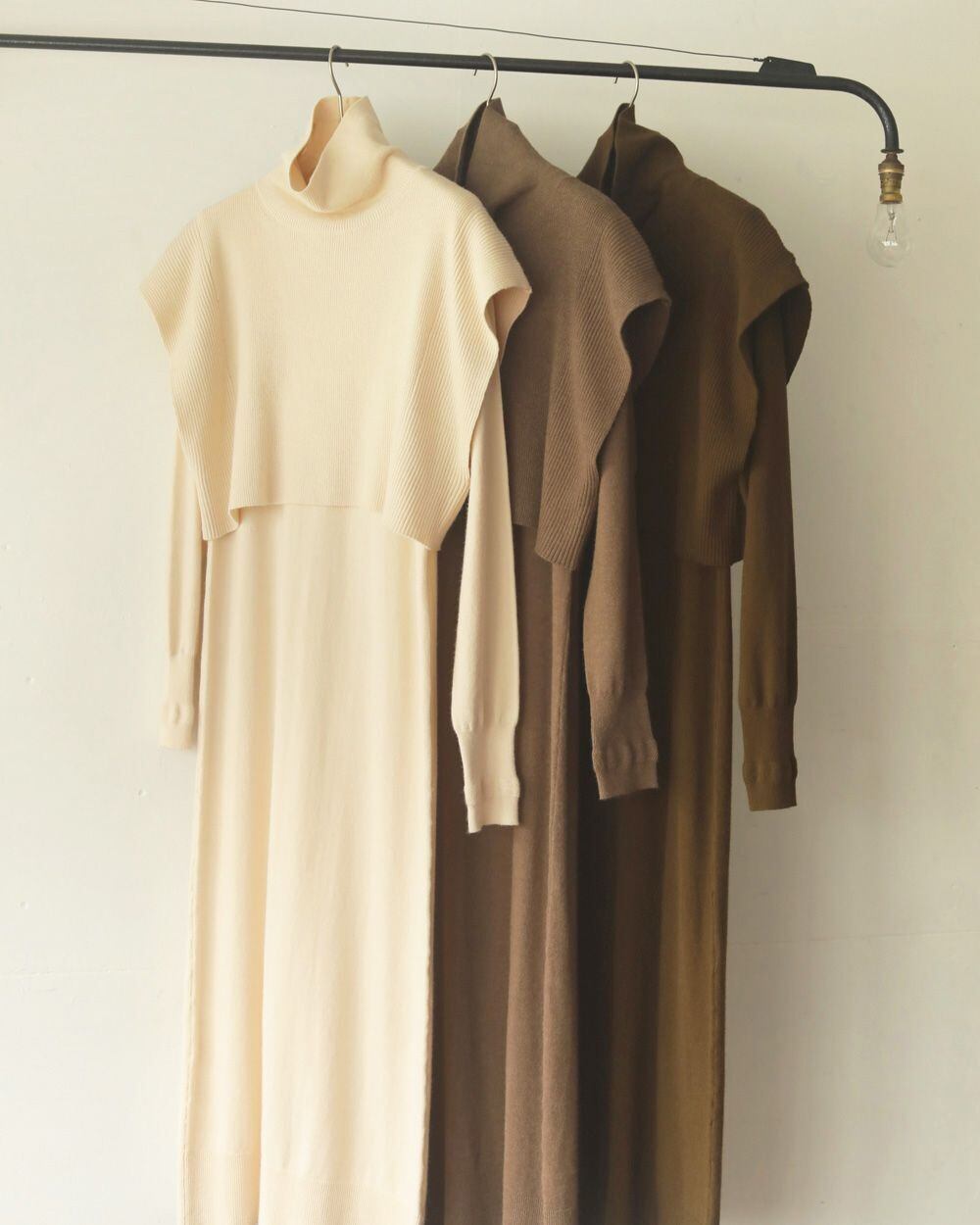 クルーネックのニットワンピースとタートルベストのレイヤードが楽しめる1着。重ねて着ることで動きがでて、スタイリングいらずなのも魅力。もちろんそれぞれ単品でも着てもらえます。なめらかな肌触りで、柔らかい着心地も魅力。