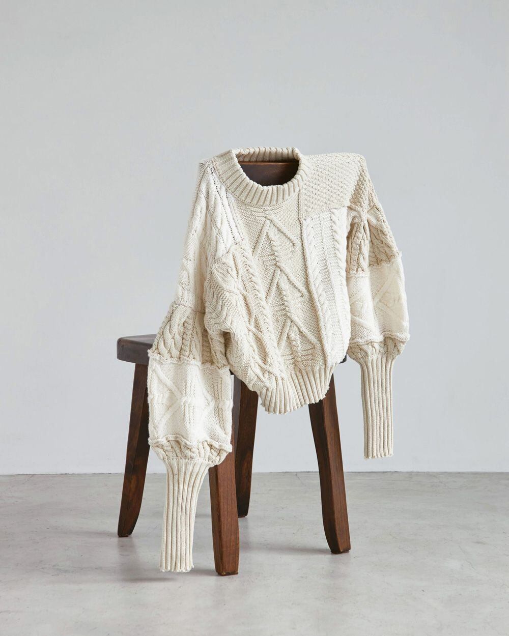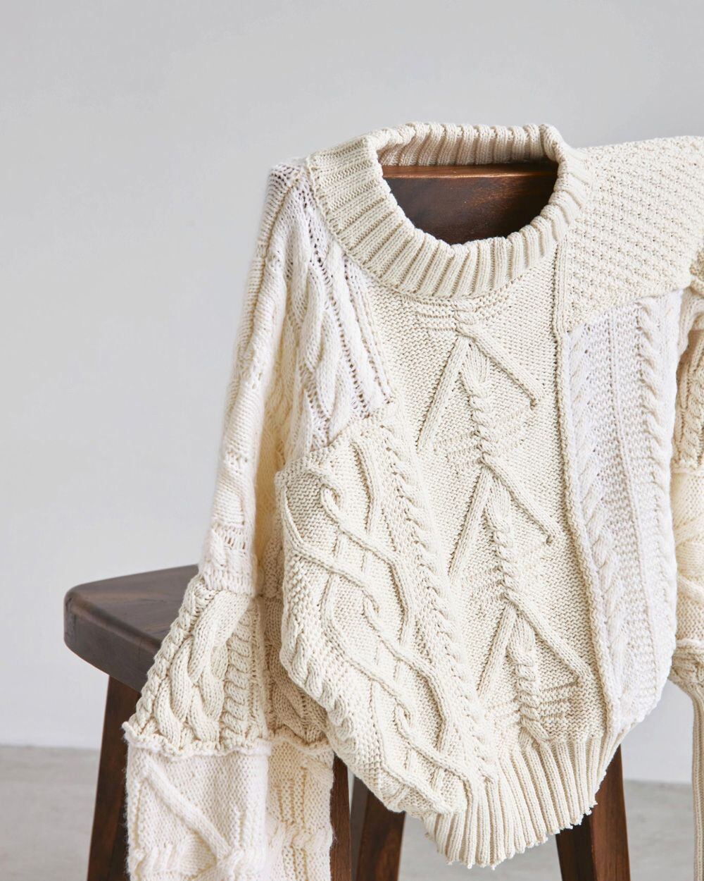 いくつもの柄を組み合わせたパッチワークニット。糸も2種類使用し、立体感と表情を出しています。パフスリーブを引き立たせる袖のリブも、他にはないデザイン。短めの着丈で、ハイウエストのパンツと好相性。裾のダメージもさりげないポイント。