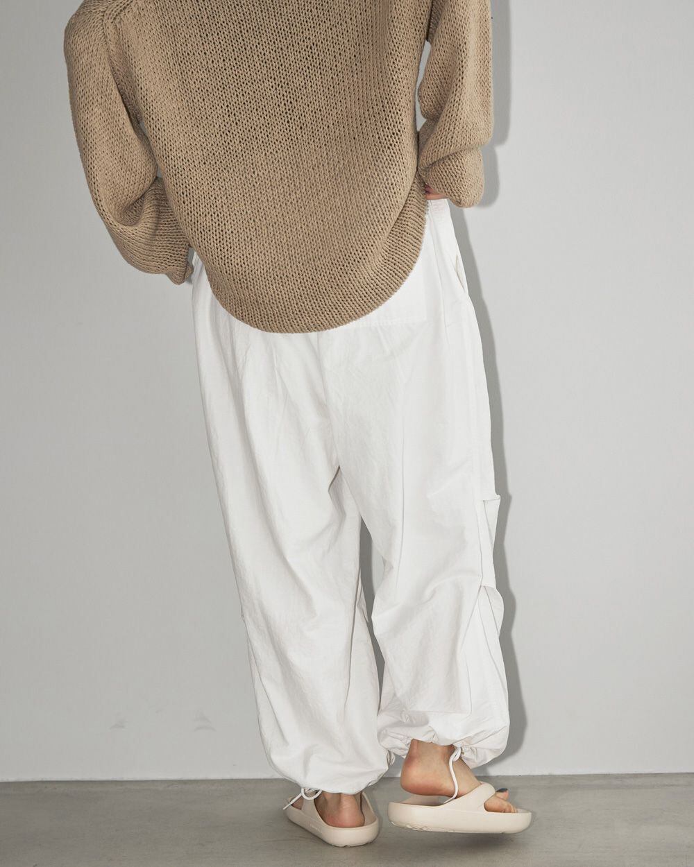 ナイロン素材のボーイフレンドパンツ。ウエストと裾はドロスト仕様でお好きなようにキュッと絞って穿いていただけます。大きなフラップポケットや、膝下に入れたタックがポイント。タンクトップなどともよく合いますが、あえて女性らしいブラウスと合わせてギャップを楽しむのもおすすめです。ホワイトには膝上丈のペチコートが付きます。