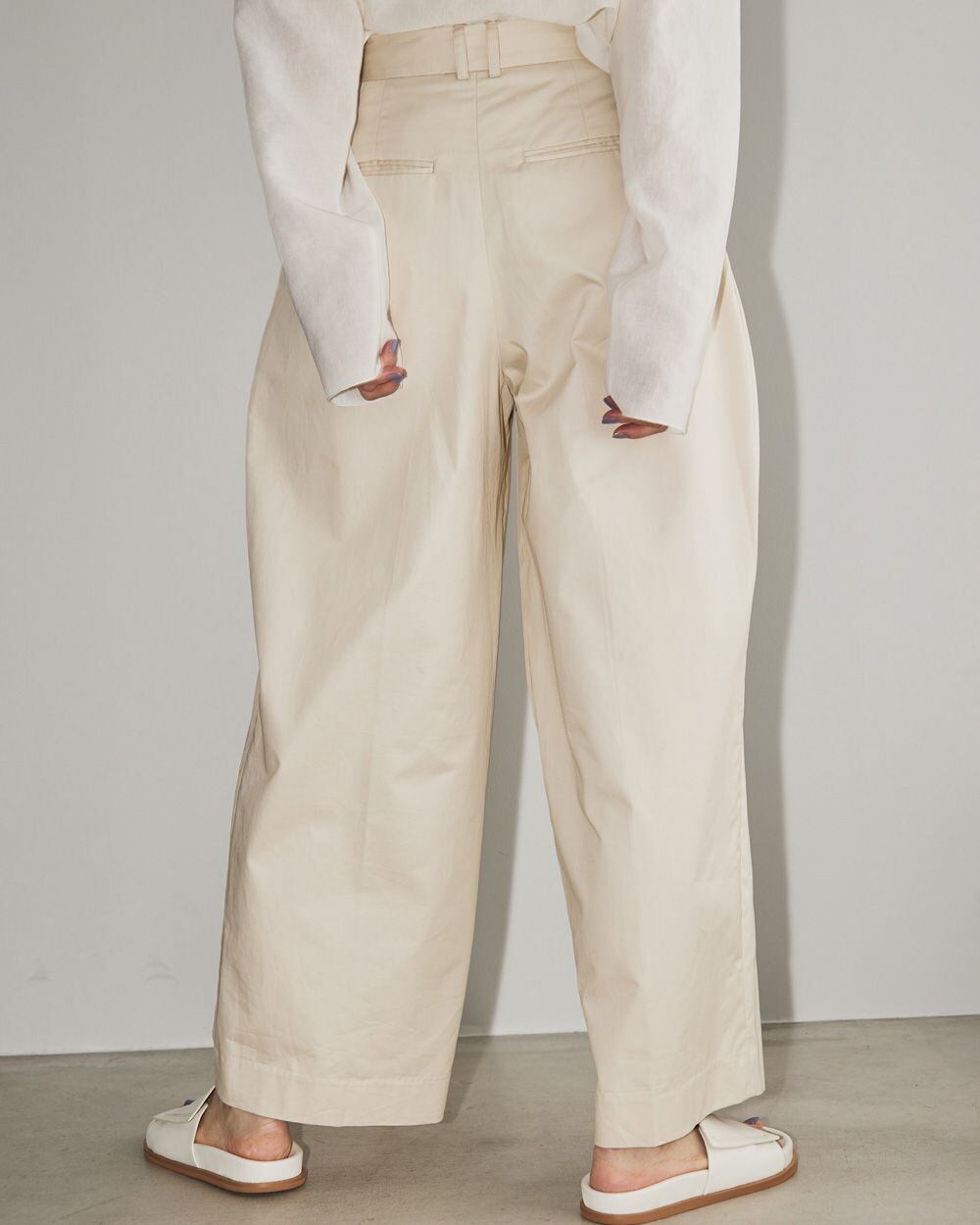 4本のタック使いがポイントのトラウザー。少し光沢のあるツイル地が上品。ボリュームのあるテーパードシルエットなので、トップスはタイトなものや、インして着るのがおすすめです。内側の仕様にもこだわっています。