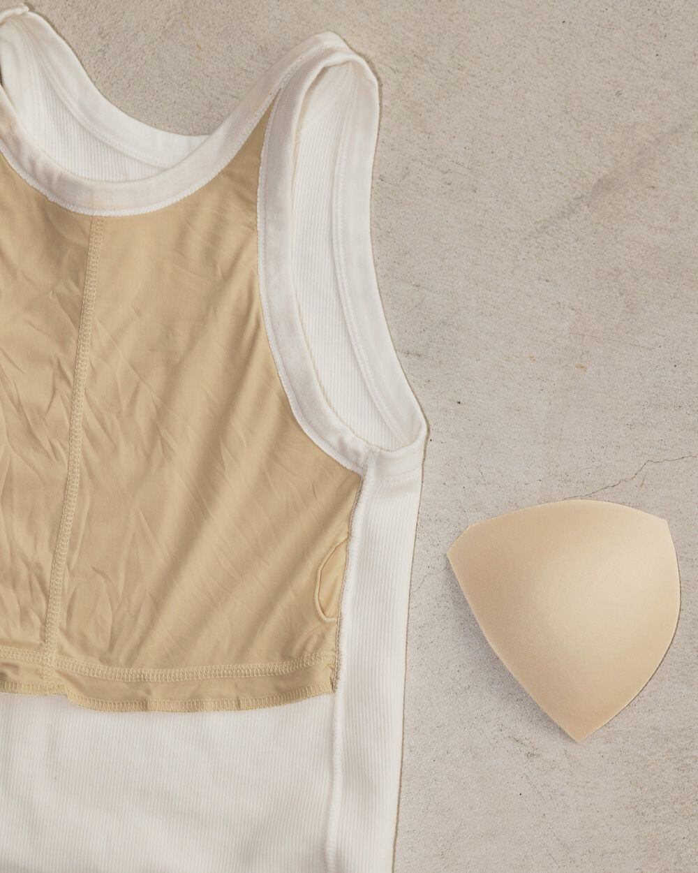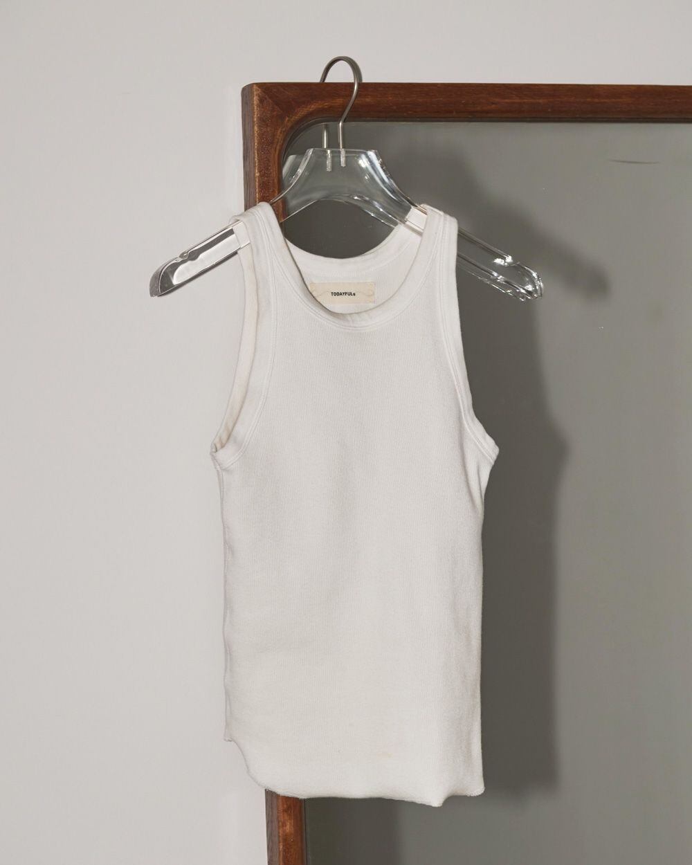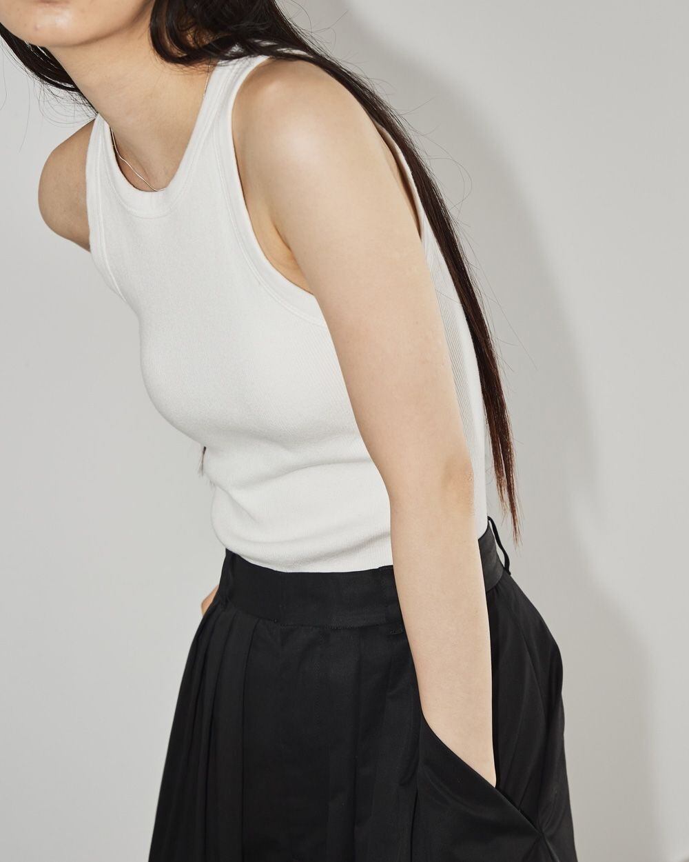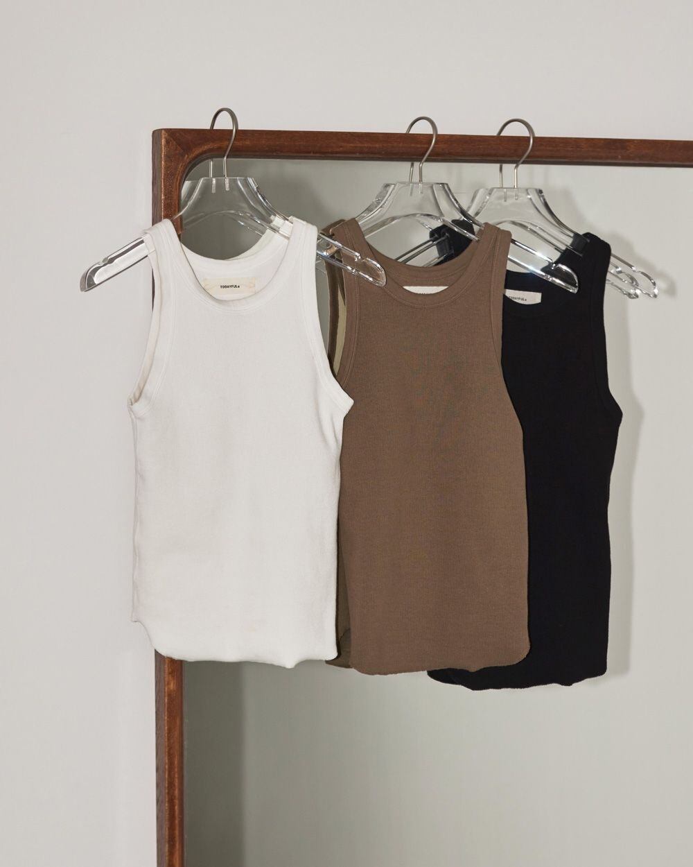 カップインのリブタンクトップ。下着のラインを気にすることなく着ていただけます。1枚でもシャツやドレスなどのレイヤードに重宝します。肩周りを華奢に見えるようシルエットに拘りました。伸縮性がありほどよいフィット感で、ボトムにインしても綺麗です。1枚あると便利なアイテム。※カップは取り外し可能。