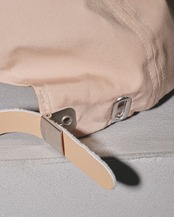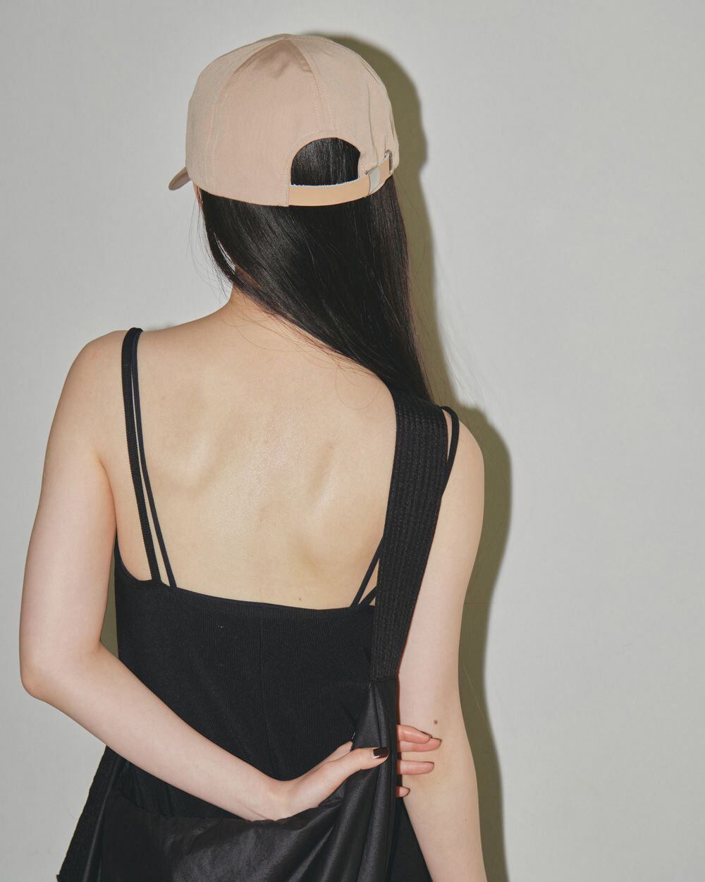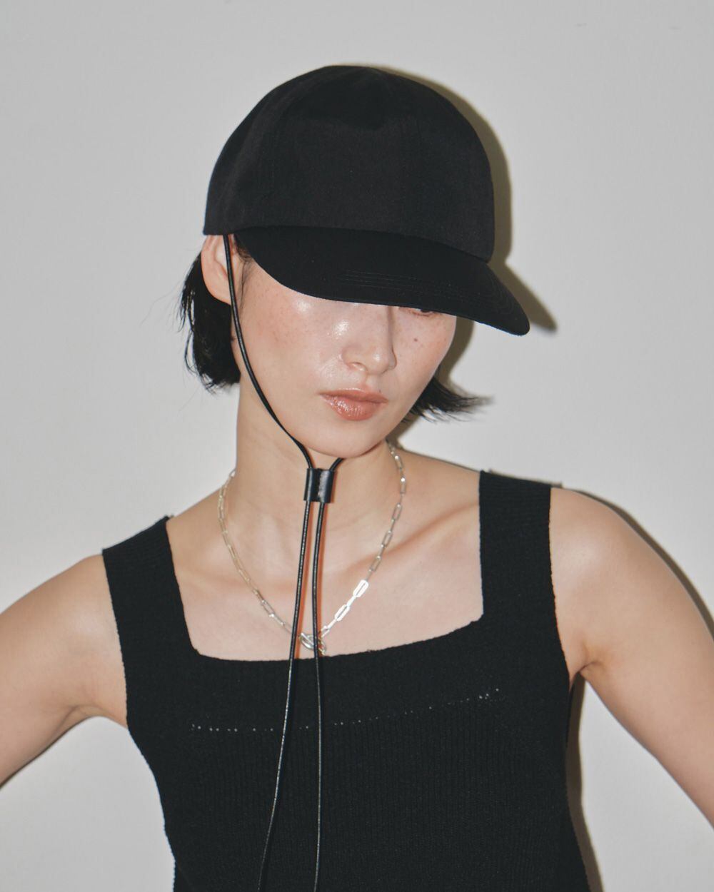 通年つかえる生地で、防水加工が施されたコード付きキャップ。同色のステッチやレザーコードがさりげない存在感を放ち、紐先のシルバーパーツが女性らしさを演出。普段のワードローブに取り入れるだけでスタイリングのアクセントに。フェミニンやドレッシーなアイテムとの合わせもおすすめです。