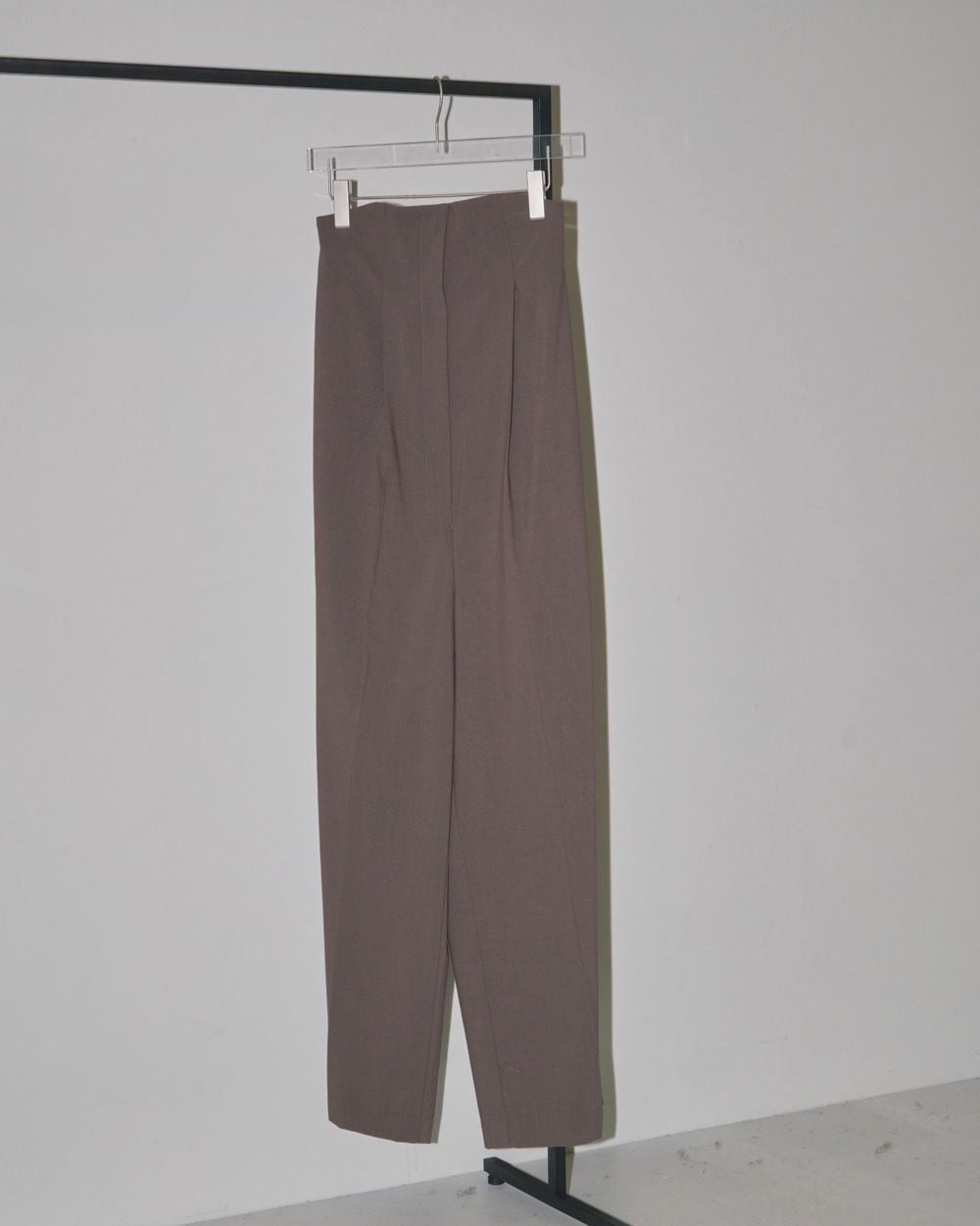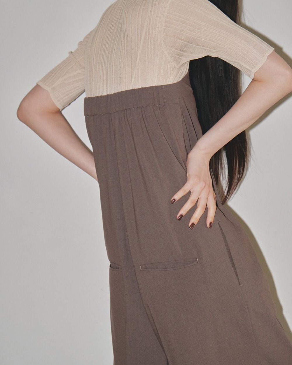 ウール混のきれいな表情のツイル生地を使用したベアコンビネゾン。左右にあしらった深めのシングルタックと、センタープレスの利いたデザインが魅力。パーティールックな着こなしはもちろん、シャツやカットソーをレイヤードしても◎ サイズ調節が可能なタブ付き。