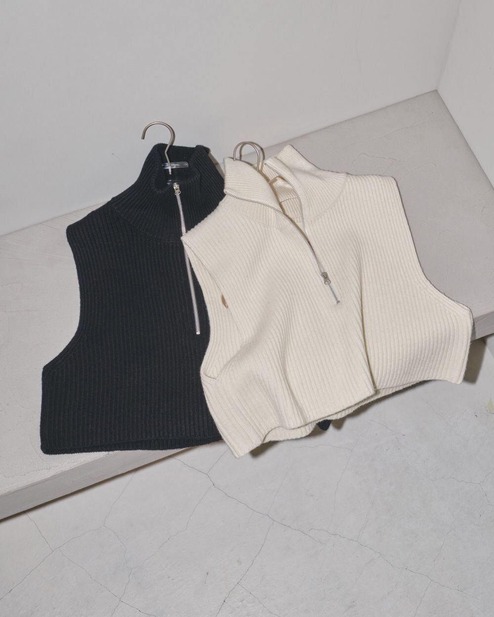 ショート丈のニットベストなのでボトムスのシルエットを選ばず着用できる1枚。首もとのジップを下げて抜け感のある着こなしから、襟を立てる着こなしまで様々なスタイリングにアクセントをプラスしてくれます。